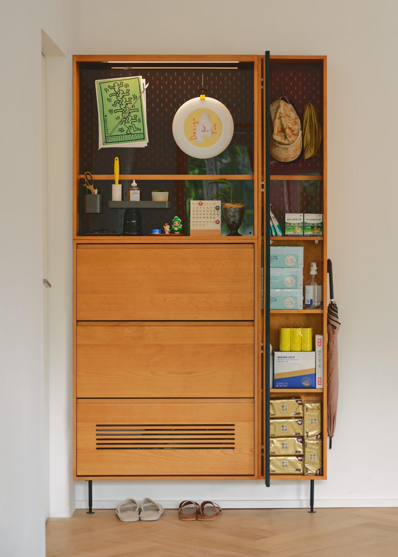 ตู้รองเท้าแบบบาง ยุคญี่ปุ่นสไตล์นอร์ดิก ได้รับการออกแบบให้สามารถใช้งานได้หลายฟังก์ชัน เช่น การใช้งานเป็นตู้เก็บรองเท้าและของใช้ทั่วไป หรืออาจมีช่องเก็บของเพิ่มเติมสำหรับใส่ของอื่น ๆ เช่น หมวก, เสื้อผ้า, หรืออุปกรณ์อื่นๆ